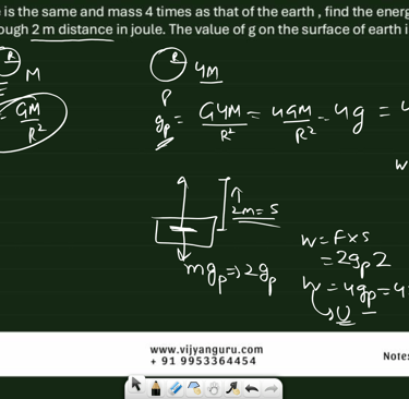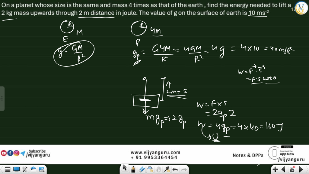 Q 2. On a planet whose size is the same and mass 4 times as that of the earth , find the energy needed to lift a 2 kg mass upwards through 2 m distance in joule. The value of g on the surface of earth is 10 m/s square